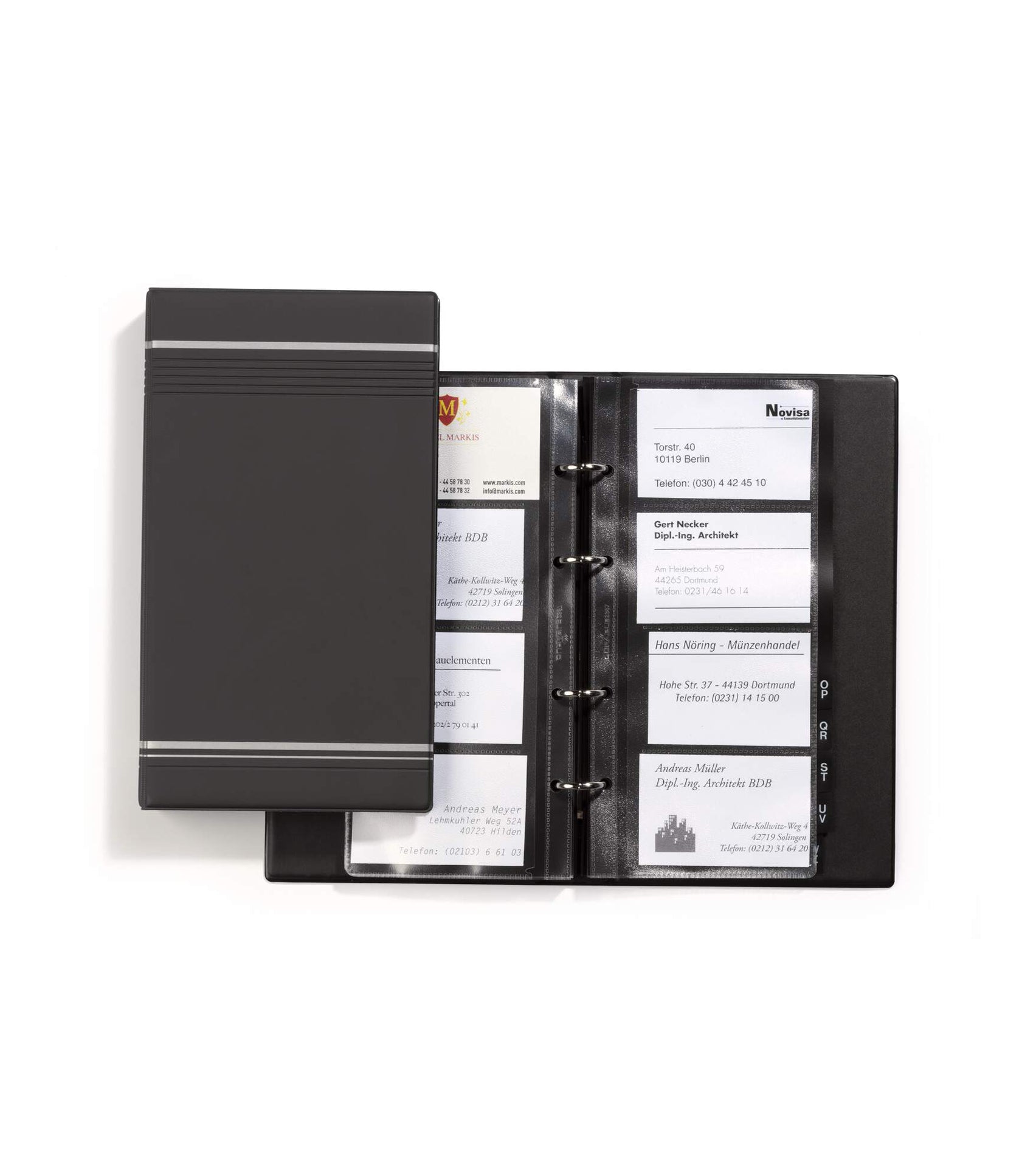 • Business card ring binder with matt finished surface with decorative silver stripes